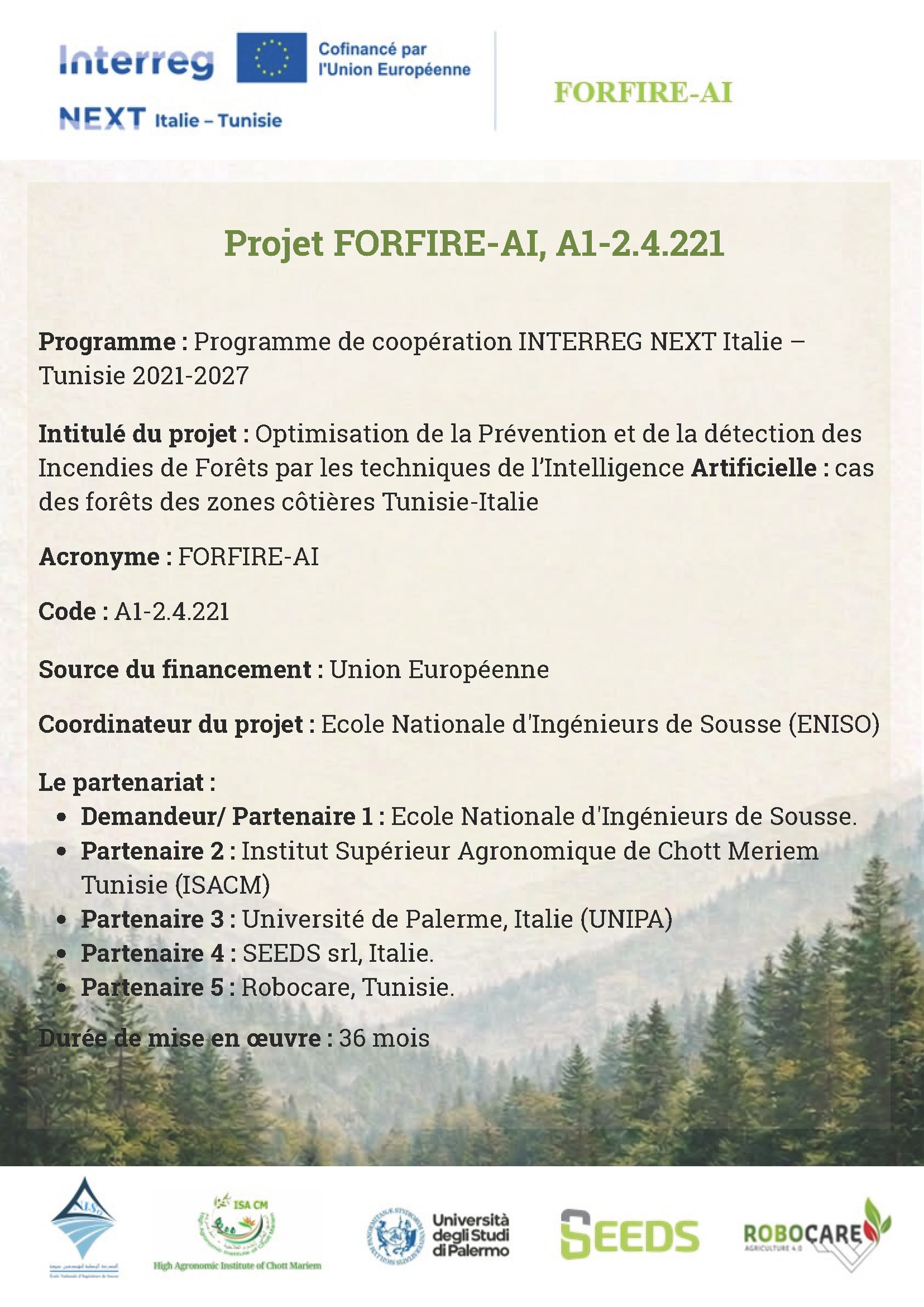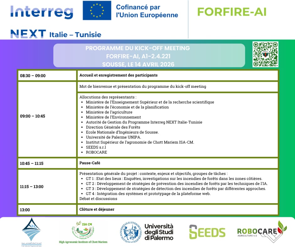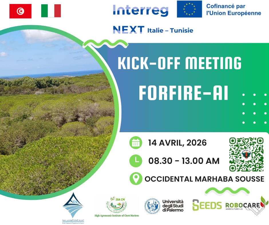 Kick-Off Meeting du projet FORFIRE-AI, qui se tiendra le mardi 14 avril 2026 à Sousse, à partir de 08h30. Optimisation de la prévention et de la détection des Incendies de forêts par les techniques de l’Intelligence Artificielle : cas des forêts des zones côtières Tunisie-Italie .